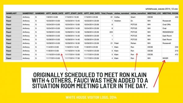 A National Pulse review of White House Visitor Logs from November 2014 reveals a meeting in the White House Situation Room, chaired by then-Ebola Czar Ron Klain. The meeting appears to have been coordinated by Dr. Anthony Fauci, and included several high-level U.S. government agency heads.