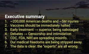 • Make available the analysis of the 11,000 deaths investigation in VAERS for public inspection. It’s important for the public to understand why the CDC couldn’t attribute a single death to the vaccine whereas one of the world’s top pathologists ascribed at least 30% of all deaths to the vaccine.