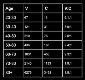 V:C in the US is not favorable for any age. The table shows the V:C numbers by age.