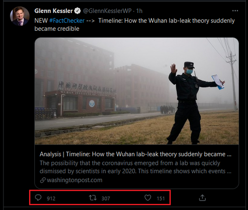 Fast forward one year, and Kessler is the proud owner of a highly ratio’d tweet after being forced to eat crow over his ‘fact checking’ with a new article entitled “How the Wuhan lab-leak theory suddenly became credible.”