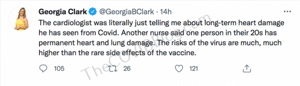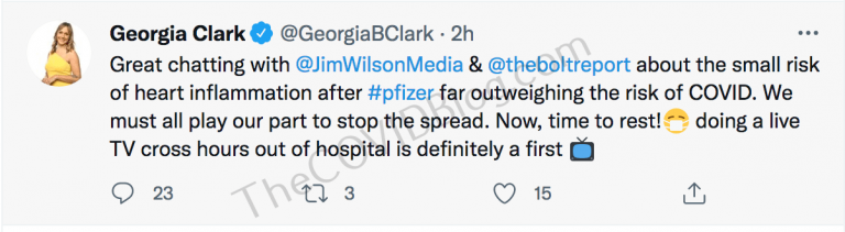 Ms. Clark encouraged everyone to get the injections and “take the side effects on the chin.” She continued tweeting that day, apparently trying to convince herself that potentially-permanent heart problems are better than COVID-19 and that these side effects are “rare.” Ms. Clark was discharged yesterday, saying she would be “down and out” for a couple of days.