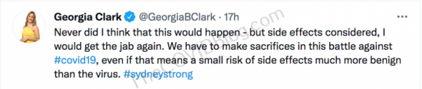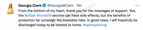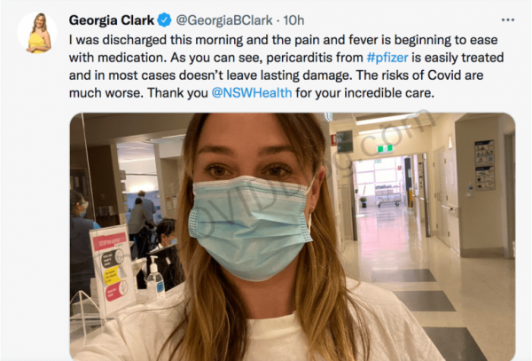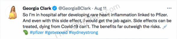 She was back on Twitter this morning (about 10 p.m. in Sydney), again, trying to convince herself that the pericarditis adverse effects are rare and that it’s better than COVID-19.