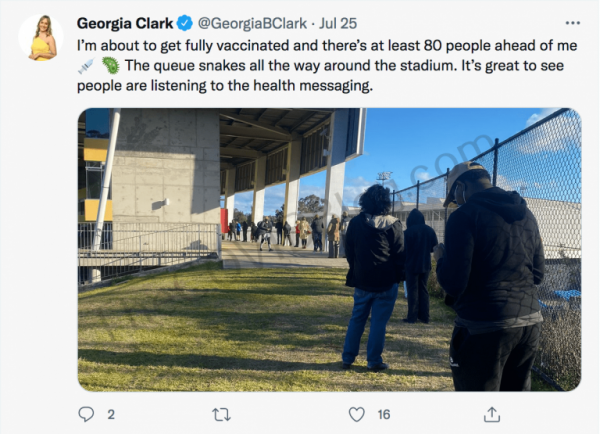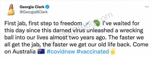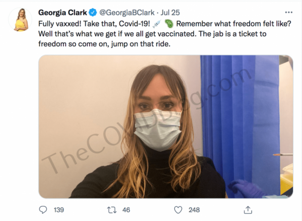 Ms. Georgia Clark received her first dose of the experimental Pfizer mRNA [vaccine] on July 2, according to her Twitter account. She posted a short video, along with a tweet saying “first step to freedom.”