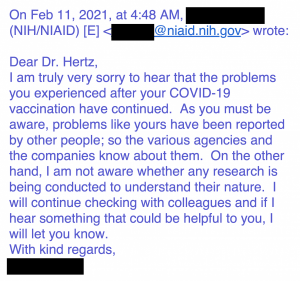 In a Feb. 11 email exchange (see below) between Hertz and the NIH and NIAID (the agency led by Dr. Anthony Fauci) just two months after COVID vaccines received Emergency Use Authorization, an official acknowledged other reactions like the ones Hertz experienced had been reported and agencies were aware of them.